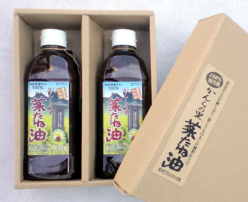 純国産菜種一番しぼり。500g入り菜たね油2本入りセット。贈り物に最適です。